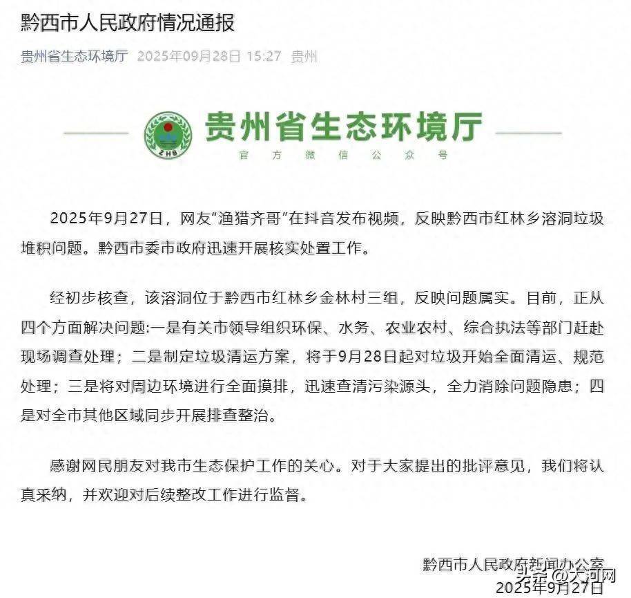 2025年9月27日,网友“渔猎齐哥”在抖音发布视频,反映黔西市红林乡溶洞垃圾堆积问题。黔西市委市政府迅速开展核实处置工作。